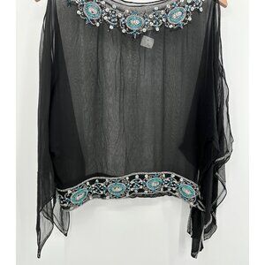 La Nuit 100% Silk Top Women Black Sheer Beaded Sequin Open Shoulder Side Tie
