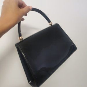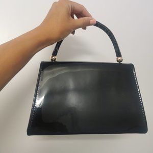 Faux shiny leather, polyester lining. Magnetic closure. One small pocket on the inside. Was used only once or twice. Looks very cute with vintage inspired clothes!
