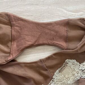 Brown sheet mesh with cream lace details.