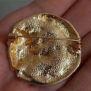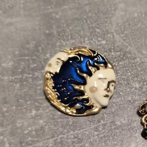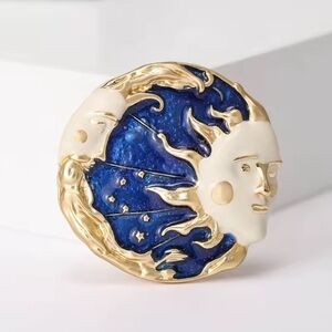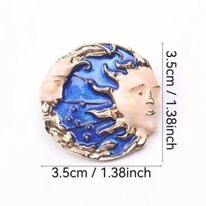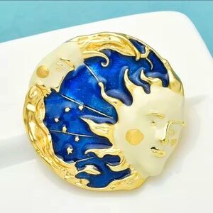 Elegant gold and blue brooch featuring a sun and moon design. Perfect for adding a celestial touch to any outfit.
