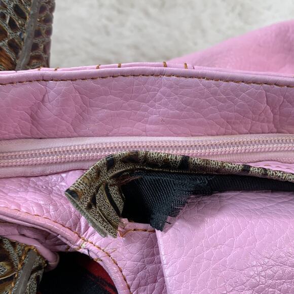 Large hobo bag with attached fold over style coin purse. Features bronze croc handles, pipe edging, and silver Hardware. Seam loose at opening of coin purse pouch, pictured.