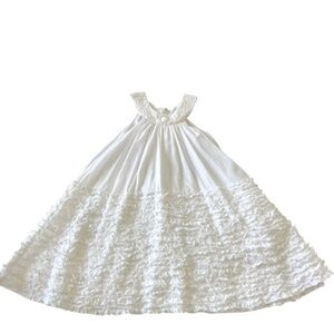 La Piccola Danza solid white sleeveless Dress. The bottom portion of the dress is ruffled. Sweet white beading around the neck. Hidden back zipper. Fully lined.