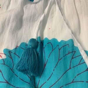 100% cotton, elastic waist with ties and tassels, hits above knee (errs on the more conservative side than our smocked skirts), pockets (of course)!!!” Lined.