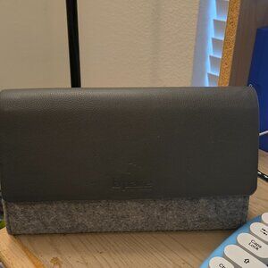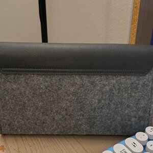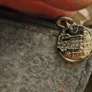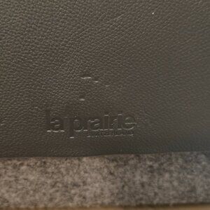 A La Prairie cosmetics bag has silver detailing with the prairie emblems. Has a gray leather flap and a wool gray body. It is brand n Marks nowhere and tear marks. New but tags are not on it has never been used. There are a few marks at the very front tab where the emblem LA prairie is.