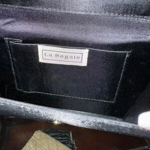 Keywords: La Regale, black satin clutch, evening bag, party clutch, cocktail accessory, small clutch, magnetic snap closure, detachable strap, interior pocket, women's clutch, elegant handbag, pre-owned clutch, sophisticated accessory, versatile styling, evening wear.