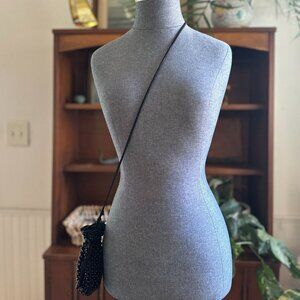 An elegant black beaded evening bag with a drawstring closure and a versatile crossbody strap for parties or formal occasions. The label inside reads Le Regale Ltd. Hand Made in China