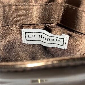 Stylish metallic bronze clutch. Features a sleek design and chain strap. Ideal for evening outings.