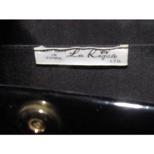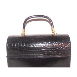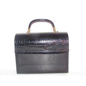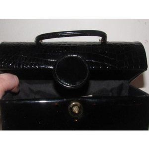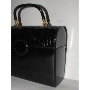 This purse is the epitome of mid century mod style! It is made of smooth black patent leather as the body and the hinged top is made of crocodile embossed patent leather. It has a hard, smooth black Lucite handle at the top. This hard, boxy style purse is called a 'lunchbox'. At the center, it has a round, patent leather snap closure. The interior is lined in very clean black fabric. There is one compartment inside with one pocket. It has a tag inside that reads 'Hand Made in China, La Regale, Ltd'.