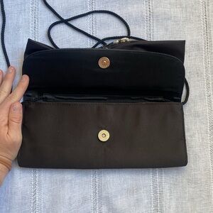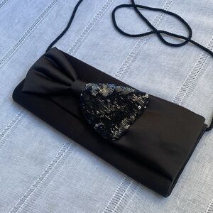 La Regale vintage black envelope evening purse. Like new! Size small. Stunning black satin and sequin bow on the front. Envelope style with button clasp. One compartment with small interior pocket. Interior is immaculate. Perfect for a special occasion, prom, or date night. Delicate rope strap.