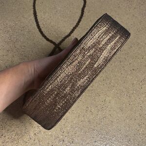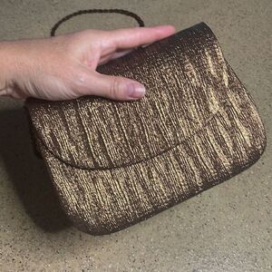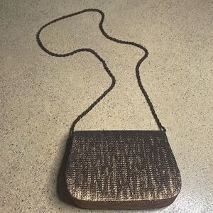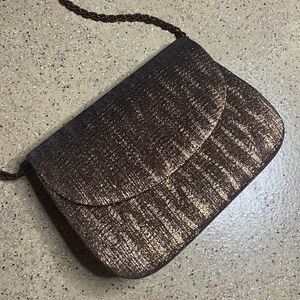 La Regale 90s Copper Metallic Fabric Crossbody Evening Bag w Woven Beaded Strap. Features pretty metallic animal print textured fabric, magnetic closure, interior slip pocket, pretty woven beaded crossbody strap that can easily be tucked inside the bag if you want to carry it as a clutch. Such a pretty little bag in a great color!