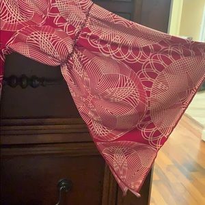 The perfect addition to your fall wardrobe! Burgundy tunic with sleeves that are cinched at the elbow, then are flowy with a split at the bottom! Very comfortable and stretchy.
