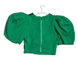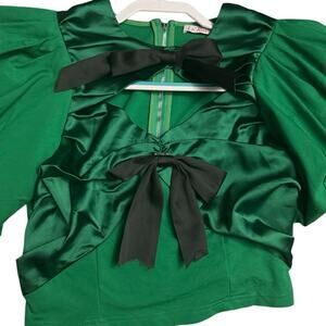 Tags; Emerald green satin top, puff sleeve blouse, La’ Ros designer top, statement bow top, holiday party blouse, festive evening wear, structured green top, trendy women’s blouse, bold evening wear, formal chic blouse.Very good preowned condition. No rips, stains or tears