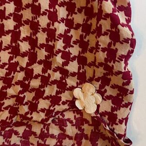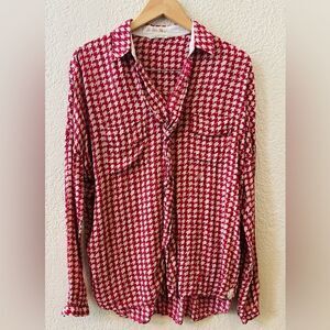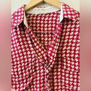 Stunning Italian blouse by La Sarte Pettegole. Beautifully draped with a twisted ruffle down the front. Lovely details added to this blouse the bottom of the shirt features a delicate embroidered flower on both sides. Logo embroidered on the left side. Delicate buttons on each sleeve Red and white pattern. Missing a size tag but could fit either a small or medium based on measurements. See pictures for measurements.