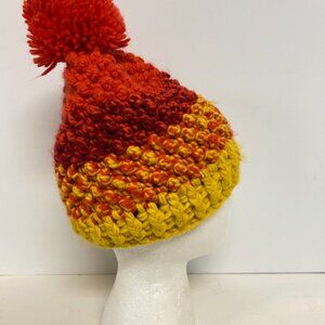 La Sportiva brand Women’s pom-pom beanie hat “Terry” style. OSFM. Orange, yellow and red tones. Acrylic yarns, fleece band for comfort inside hat, La Sportiva tag on side of exterior.