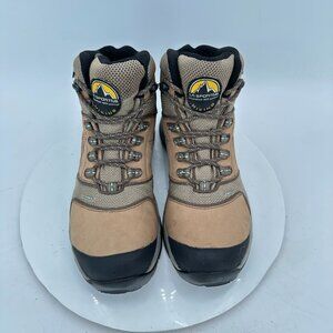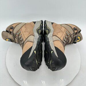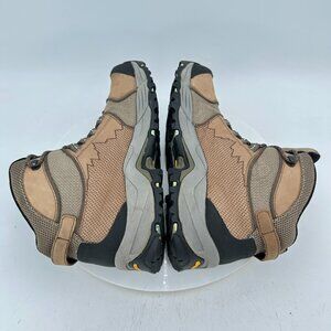 Durable ankle boots with a rugged design. Features a tan upper with black accents. Ideal for outdoor adventures.
