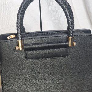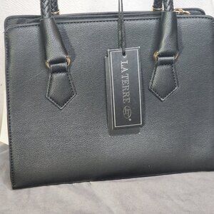 La Terre Black Peta Approved Vegan Lead Safe Braided Handle Gold Accent and Feet Handbag with Crossbody Strap.....Great Looking Handbag that has a Strap to Convert it into a Crossbody....Either way you will Love this Bag....Brand New with Tags....Callout: There is a small scratch that you can barely see ...see the picture right after the price tag photo...
