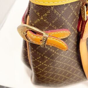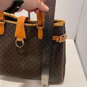 La Tour Eiffel Paris Should Bag Purse Tote Monogram Brown Tan. Gorgeous Leather Shoulder Bag. Has some pen marks on the lining and some light white marks on the back of the bag as seen in picture!