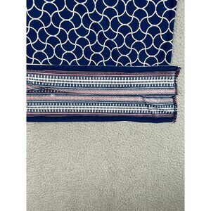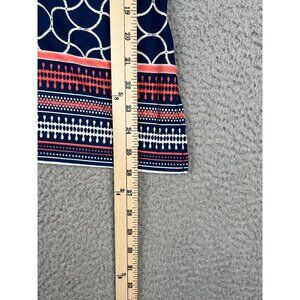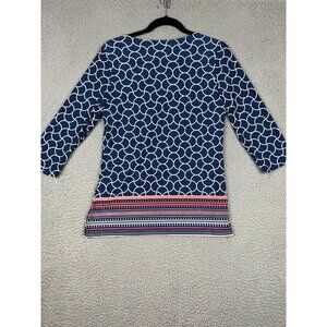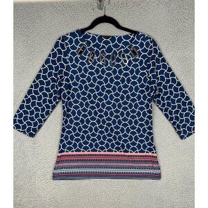 Elevate your wardrobe with this stunning La Vanya blouse. Featuring a unique geometric pattern in blue and white, this blouse is perfect for any occasion, whether it's a casual day out or a party. The blouse is made of a comfortable and durable polyester and spandex blend, making it machine washable for easy care. The classic/fitted 3/4 sleeves and round neckline add a touch of elegance to this jersey-style blouse, while the metal collar design and side slits provide a stylish edge. This blouse is perfect for women of all sizes, with a petite PM size available. Made in China, this blouse is a must-have addition to any fashion-forward wardrobe.