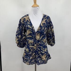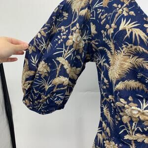 La Vie Blouse Womens L Large Navy Stone Metallic Puff Sleeve V Neck Floral Print