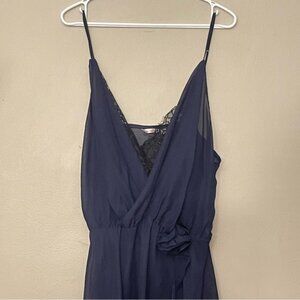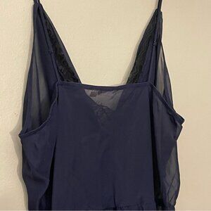 Elegant navy chemise with delicate lace trim. Features a flattering V-neck and adjustable straps. Perfect for a comfortable and stylish night.