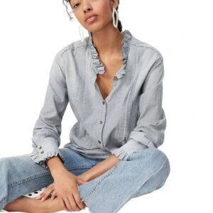 La Vie Rebecca Taylor Striped Indigo Cotton Ruffle Trim Popover Blouse Size M