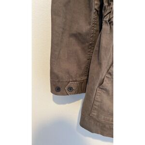 This military style jacket buttons up the front and has buttons on the sleeves. It has 2 chest pockets and 2 hand warmer pockets. The waistline is adjustable with buttons so it can be sinched tighter. The inside has a removable faux fur lining that is the softest thing I've ever touched. This coat is in excellent condition with the spare buttons still attached in a plastic bag. Size large. Military green color.