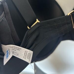 Sleek black bra with supportive underwire. Features adjustable straps for comfort. Size large and D-Large cups