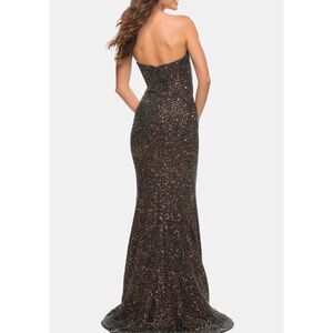 Unique iridescent strapless sequin gown with sweetheart neckline in black. Back zipper closure.