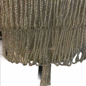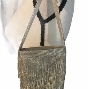 La regale vintage Art Deco style fringed metallic beaded purse small tassel hangs down. Small 5”length 4”width.