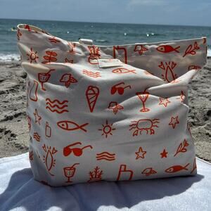 canvas tote, beach tote, orange doodles, La Roche Posay, summer accessory, casual bag, printed bag, travel bag, coastal style, seaside accessories