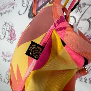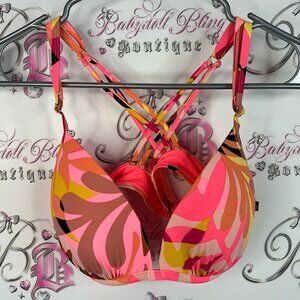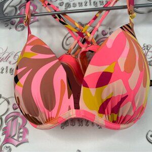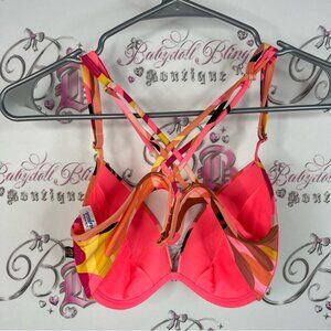 Vibrant pink and orange bikini bra style with crisscross straps. Bold floral pattern. Comfortable fit. M.