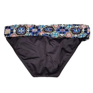 This hipster bikini bottom has a wide colorfully patterned band going around the hips. Content: nylon, spandex. Care: hand wash, line dry.