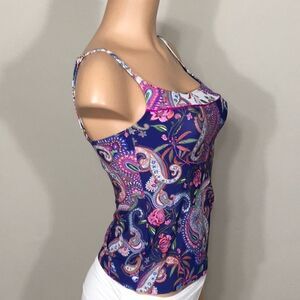 New. Be both sassy and stylish in this lingerie tankini top featuring a unique, jewel-toned scarf pattern inspired by the free-spirited Roma caravans of the Balkans. The La Blanca Scarf Gypsy Tankini Top is a beautiful pattern with colors of blue, green, pink, white, and purple .