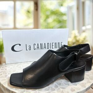 La Canadienne $475 Ricco Leather Slingback Block Heel Sandals