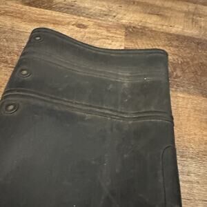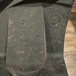 These have some scuffs and dirt. They’re made in the USA of durable rubber. The footbeds feel like they were worn in by a pervious owner.