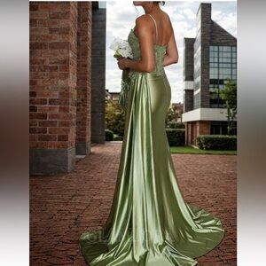 LaDivine Sage green ‘greenery’ sparkly corset long satin slit gown prom CD868