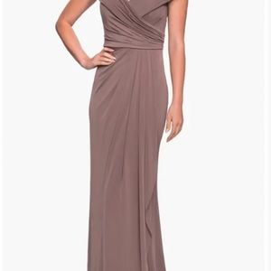 LaFemme Black Off the Shoulder Ruched Jersey Column Formal Dress Sz14