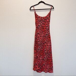 A La Maison Talulah slip dress with a vibrant leopard print. This classic silhouette gets an alluring update with an asymmetrical cowl neck and thigh-high slit.