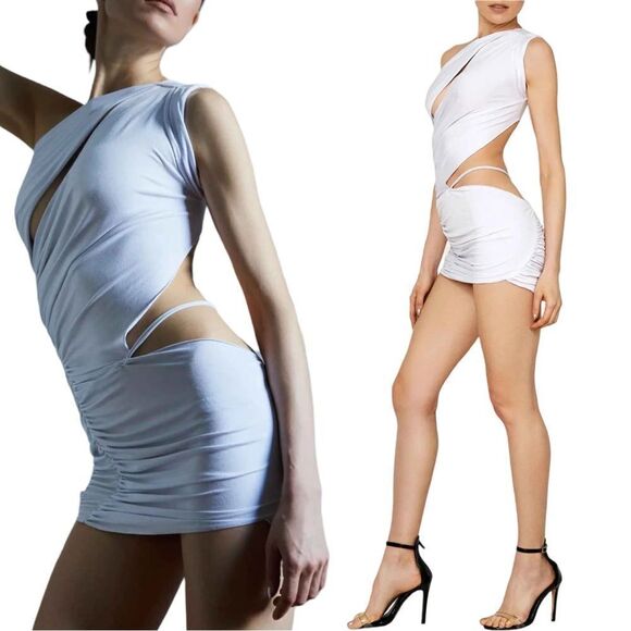 Sleek white dress with bold cut-out design. Asymmetrical style. Perfect for a night out.