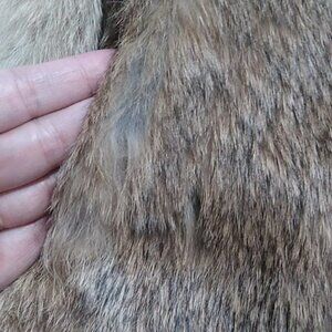 Some worn areas around the armpits, at the top and bottom of the zipper, inside back collar of neck and on the front of the right pocket. No major bald spots. Vest can be taken to a furrier to have small spots filled in. Inside is a gray ribbed cotton.