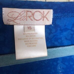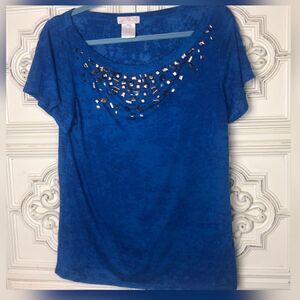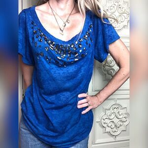 LaRok distressed blue t shirt with crystal bead detail at neckline