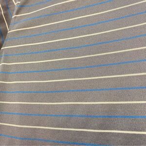 La Veen Air-Cool Short Sleeve Polo Shirt Size Large. Excellent used condition. 3 buttons at neck. Knit collar and sleeve trim. Light brown/taupe with blue stripes. Measures chest 46”, length 30”, sleeve 10.5”.