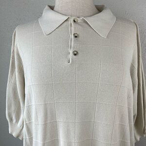 Stylish and retro silk polo top by La Veen in excellent preowned condition. It measures 21 inches armpit to armpit laying flat and 26 inches in length from shoulder to hem.