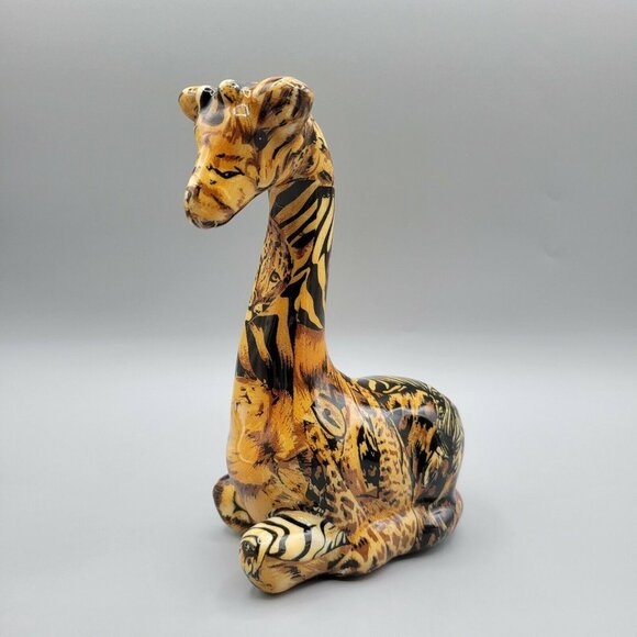 LaVie baby giraffe safari animal print fabric over ceramic figure and sealed with a glossy coating. Safari print includes leopards, cheetahs, zebras, giraffes and more!
