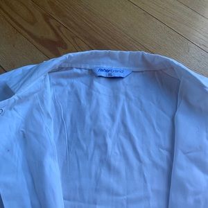Wore this for my Organic Chemistry lab. A couple of spots here and there, but overall it’s in good quality. No name on it, no holes, it should work for whatever you’ll be doing in lab.
