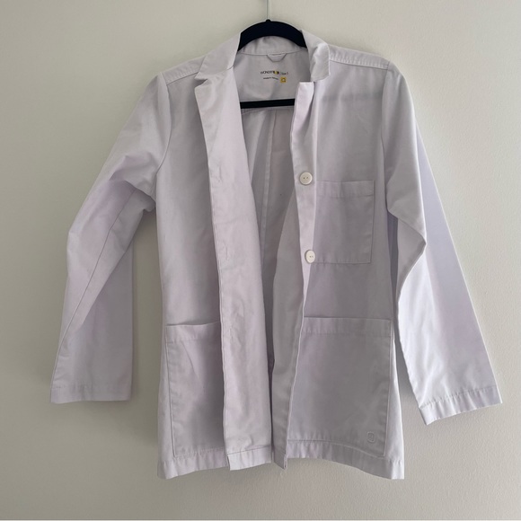 White lab coat or nursing coat. No flaws or stains. Button up. Falls at/below the butt.