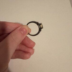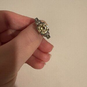 This is a sparkly silver ring with lab created Citron and Cubic zircon. It's in excellent light used condition without tarnishing.