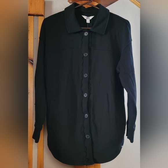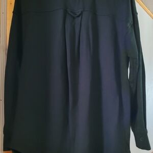 Black Onyx, loose fit, and long sleeve. 6 buttons down the front, 1 button on each wrist, and 2 pockets.