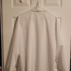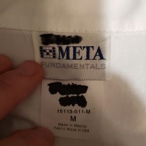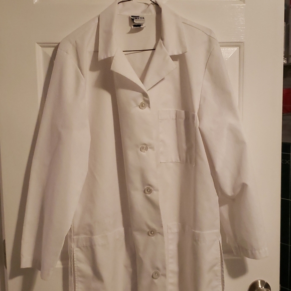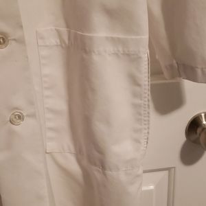White lab coat. Medium. Used 1 semester for a high school class. Area above one pocket has a small stain as shown in one of the pictures.