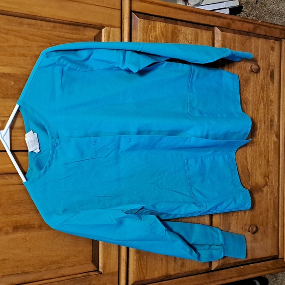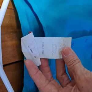 Excellent condition, worn once or twice, Stored in a plastic box and I did not have time to iron it. More of a acqua color.